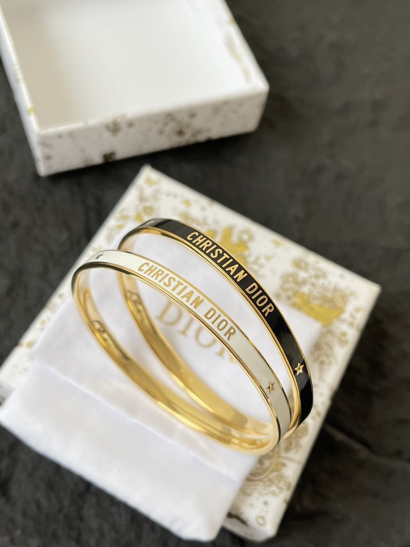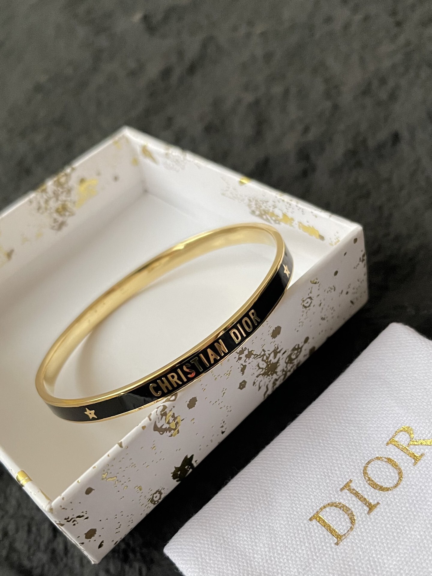 To maintain the beauty of your Dior Code White & Gold Bangle, it's important to handle it with care and follow a few simple maintenance tips. Avoid exposing the bracelet to harsh chemicals, such as perfumes, hairsprays, and cleaning agents, as these can damage the enamel and gold-tone finish. When not in use, store the bracelet in a soft pouch or jewelry box to protect it from scratches and dust.